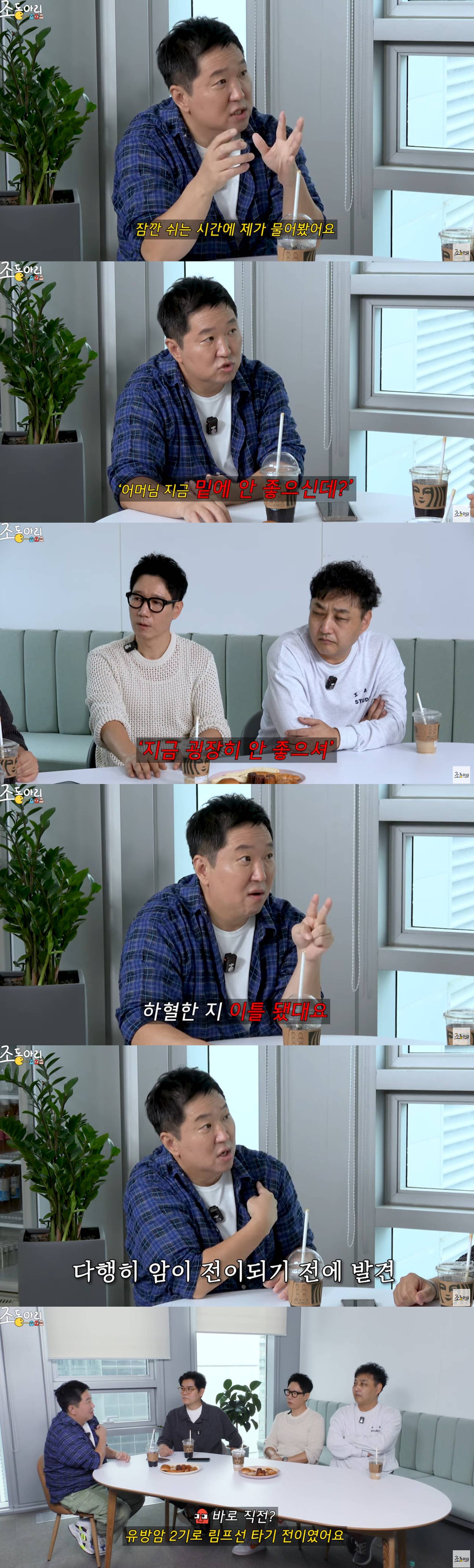 이어 "그래서 바로 엄마에게 전화했다. '엄마, 하혈해?'라고 물었더니 '하혈한 지 이틀 됐다'고 하더라. 그래서 '혹시 가슴 쪽에 멍울 잡히고 그래?'라고 물으니 '그렇다'고 했다"면서 "바로 다음날 서울로 올라와 검사했는데 유방암이었다. 유방암 2기로 림프선을 타기 전이었다. (조금만 늦었으면) 완전 암으로 다 퍼지는 건데, 림프선 바로 앞이었다"고 덧붙여 놀라움을 안겼다.